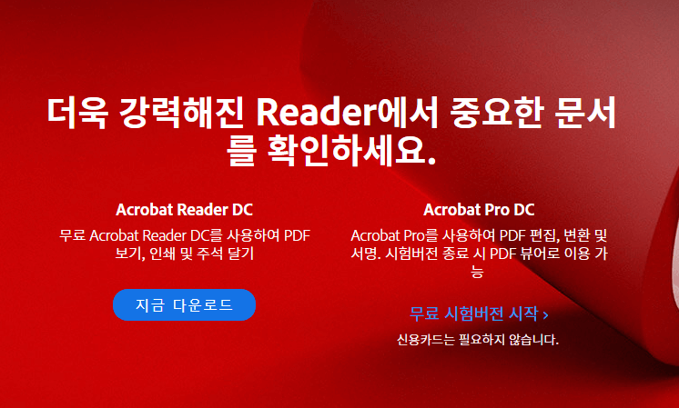 어도비 아크로뱃 리더 다운로드는 어도비 홈페이지에서 무료로 가능합니다. 한글 전용 설치 페이지를 제공하고 있어 설치는 간단합니다.