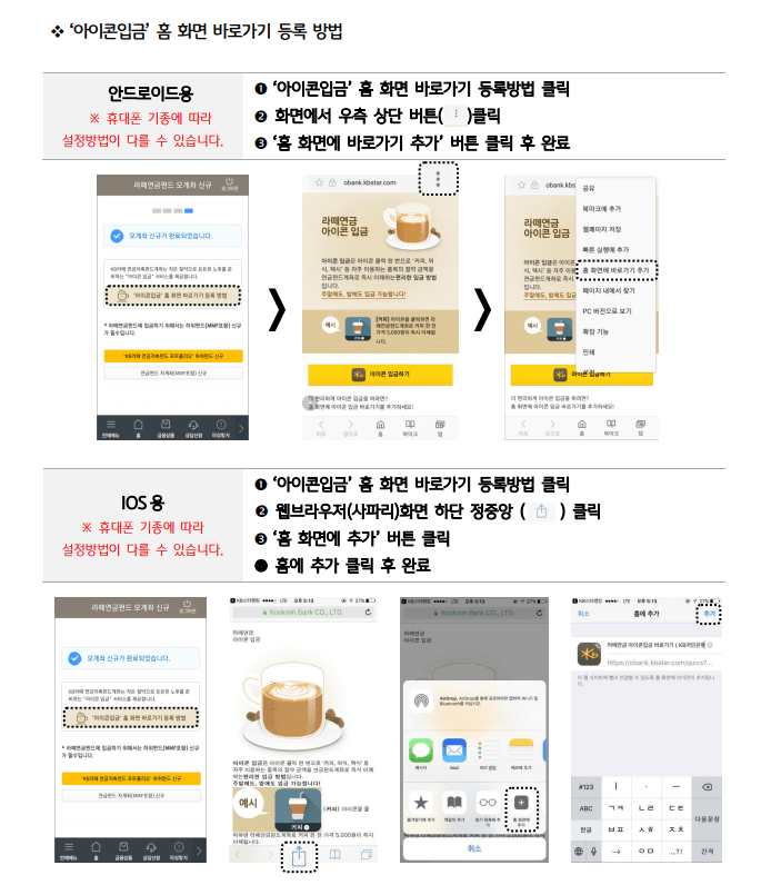 아이콘입금 홈화면 등록 방법입니다. 핸드폰 기종에 따라 조금씩 차이가 있을 수 있습니다. 아이콘을 등록해 놓으면 아이콘 클릭으로 간단하게 적립을 할 수 있습니다.