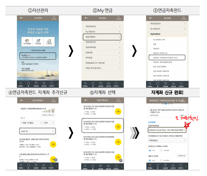 하위펀드(자계좌)를 신규개설합니다. [스타뱅킹홈 > 자산관리 > My연금 > 연금저축펀드 > 연금펀드 자계좌(MMF 포함) 추가 신규] 경로에서 가입할 수 있습니다. 최대 4개까지 다양한 상품을 선택해서 가입할 수 있습니다.