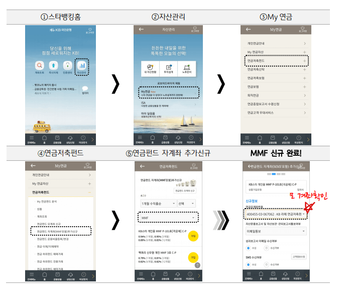 [스타뱅킹 홈 > 자산관리 > My 연금 > 연금저축펀드 > 연금펀드 자계좌(MMF 포함) 추가신규]를 통해 MMF 신규 신청을 합니다.
