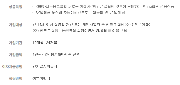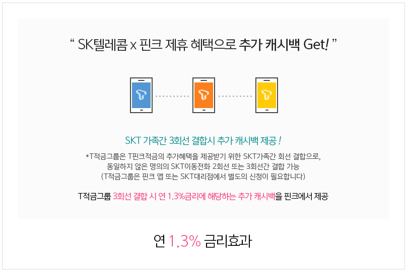 Finnq 회원 중 SKT를 이용하는 가족 또는 지인 3회선을 묶을 시 최대 연 4%의 이자를 받을 수 있는 고금리 적금상품입니다.