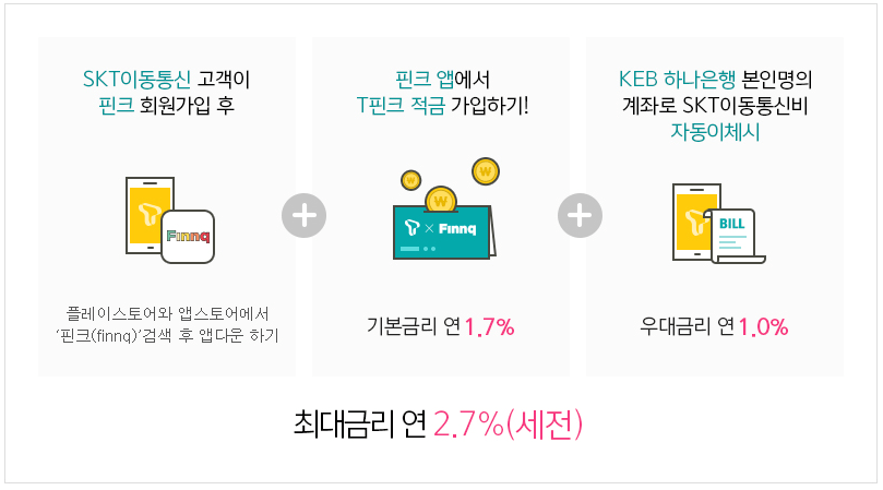 - SKT를 이용하며 통신비를 KEB하나은행 계좌로 자동이체를 하면 연 1.0% 추가 금리