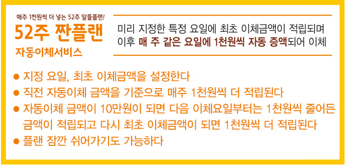 52주 짠플랜은 1년 단위로 매주 1,000원씩 납입액을 늘리는 상품입니다.