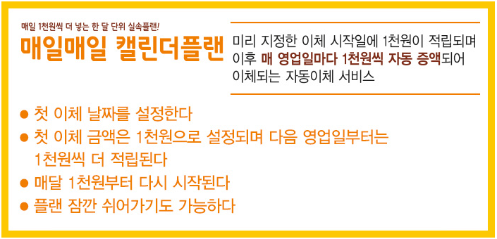 매일매일 캘린더플랜은 한 달 주기로 영업일마다 1,000원씩 입금액을 늘려가는 상품입니다.