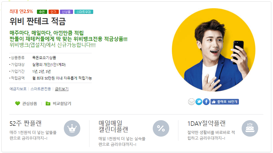 위비 짠테크는 최대 연 2.5%의 이자를 받을 수 있으며 ’52주 짠플랜’, ‘매일매일 캘린더플랜’, ‘원데이 절약플랜’ 중 자신에게 맞는 상품을 선택하면 됩니다.