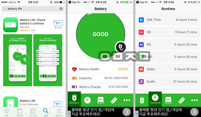 ‘Battery Life’는 아이폰 어플입니다. 앱스토어에서 ‘Battery Life’를 검색해 설치합니다.? 배터리 사이클을 확인할 수는 없지만, 초기 용량 대비 현재 용량을 확인할 수 있어 배터리 수명 판단을 할 수 있습니다.