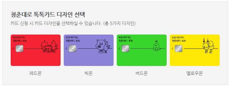 카드 신청 시 카드 디자인도 선택할 수 있습니다. 기본, 레드몬, 빅몬, 버드몬, 옐로우몬 5가지 중에서 선택할 수 있습니다.