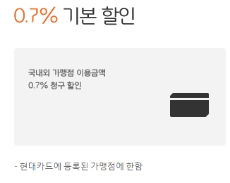 제일 기본 혜택은 국내외 가맹점 이용금액의 0.7% 청구 할인을 받을 수 있습니다.