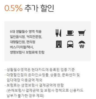 일반음식점, 커피전문점, 대형할인점, 편의점, 대중교통, 생명보험사 보험료를 결제할 경우 0.5% 추가 할인을 받아 총 1.2% 할인을 받을 수 있습니다.