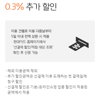 이용 다음날부터 5일 이내에 전액 상환 시 0.3% 추가 할인을 받을 수 있습니다. 생활 필수 영역에서 사용하고 5일 이내 선결제 시 총 1.5%의 할인을 받을 수 있는 것입니다.