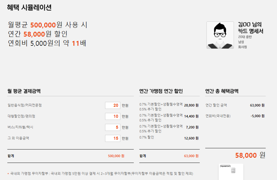 다음은 현대카드 홈페이지에서 제공하는 혜택 시뮬레이션입니다. 다만 조심히 봐야 할 부분은 결제금액은 월평균이며, 할인 금액은 연간 할인 금액이기 때문에 꼼꼼히 살펴보셔야 합니다.
