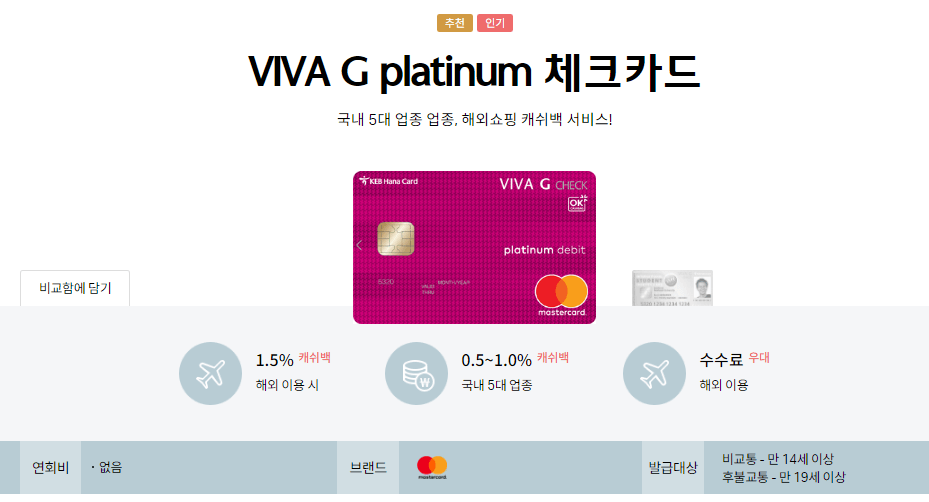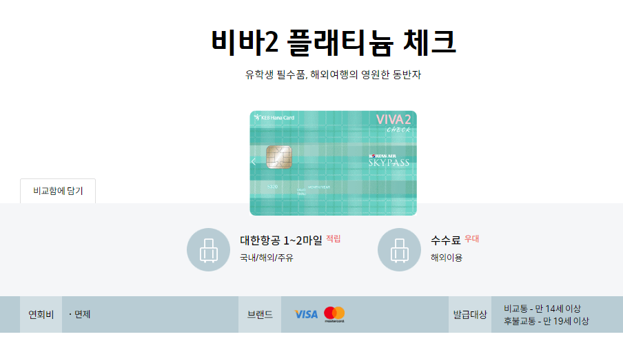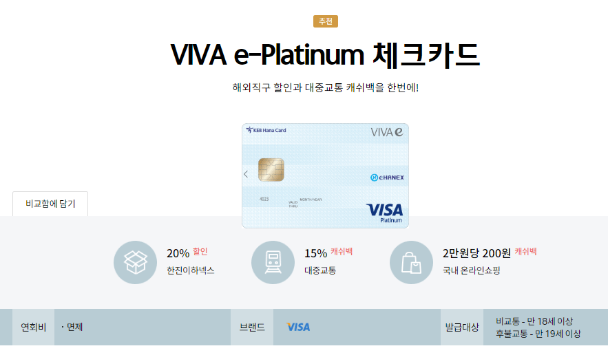 요즘은 해외여행이나 해외직구가 활성화되어있어 관련 카드가 인기가 많습니다. 해외 결제 혜택이 있는 하나은행 체크카드에는 비바체크카드가 있습니다.