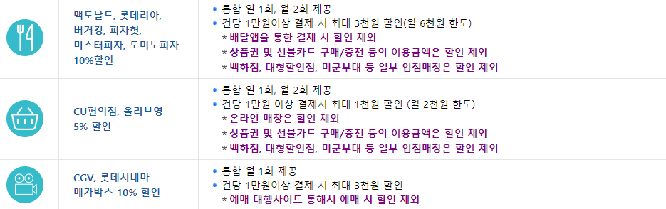 체크카드치고는 혜택이 참 많습니다. 또 젊은 층에서 많이 이용하는 분야에서 혜택을 제공하고 있어 아마 할인 한도가 부족해 할인을 못 받는 경우가 생길 것으로 보입니다.
