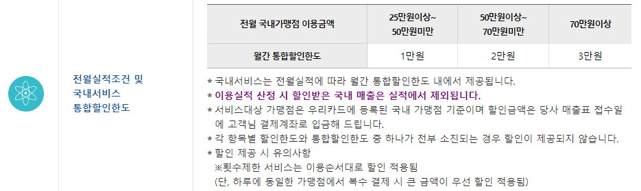 체크카드가 알짜배기 혜택이 너무 많아 이걸 진짜 받을 수 있을까 싶으셨을 것입니다. 물론 월간 통합할인 한도가 있습니다. 월간 통합할인 한도는 전월 국내가맹점 이용금액에 의해 결정되며 아래 표를 참고하시기 바랍니다.