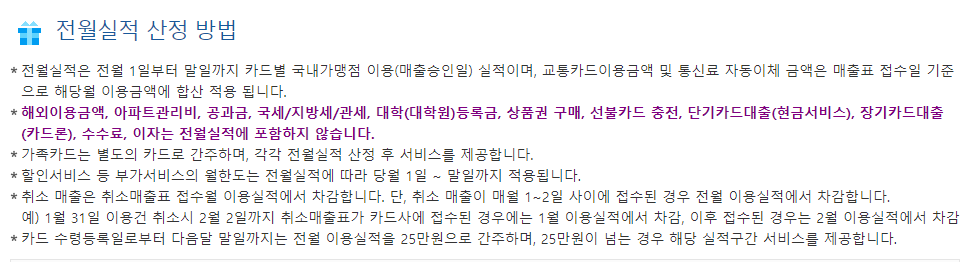해외결제 금액, 공과금, 아파트 관리비, 각종 세금, 등록금, 상품권 구매, 수수료, 이자, 대출? 등은 전월 실적에 포함되지 않습니다. 자세한 내용은 다음과 같습니다.