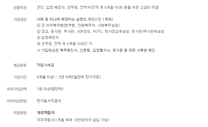 반면 하나은행은 의무복무병, 간부, 입영예정자 심지어 전역 후 6개월 이내인 분들까지 가입을 할 수 있는 적금입니다.