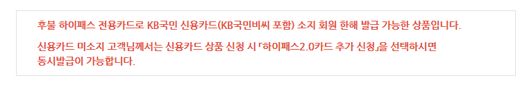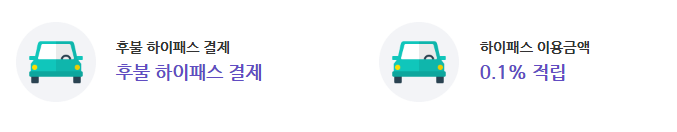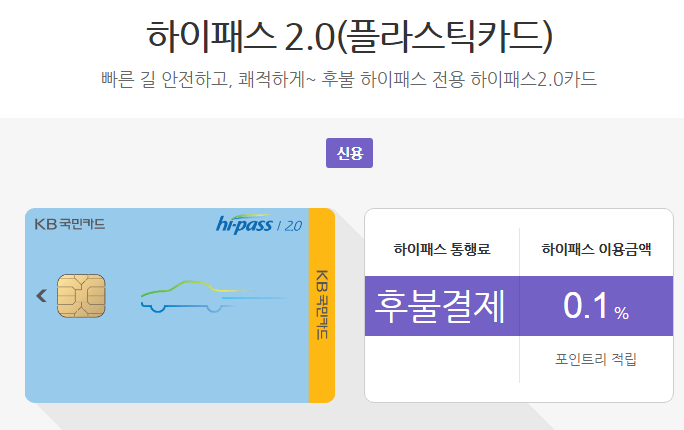 KB국민 하이패스 2.0 카드는 후불로 고속도로 통행료가 청구되고 실적의 0.1%의 포인트리가 적립됩니다.