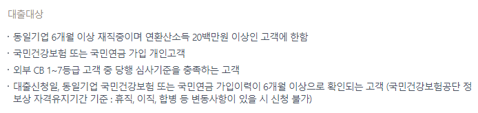 한 회사에서 6개월 이상 재직 중으로 연 환산소득 2천만 원 이상이어야 합니다. 국민건강보함이나 국민연금에 가입되어 있어야 하고, 한 회사에서 6개월 이상 가입이 되어있어야 합니다.