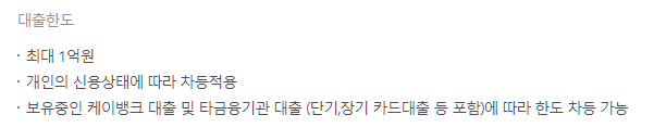 대출한도는 최대 1억 원으로 대출자의 신용상태에 따라 대출한도는 변동됩니다.