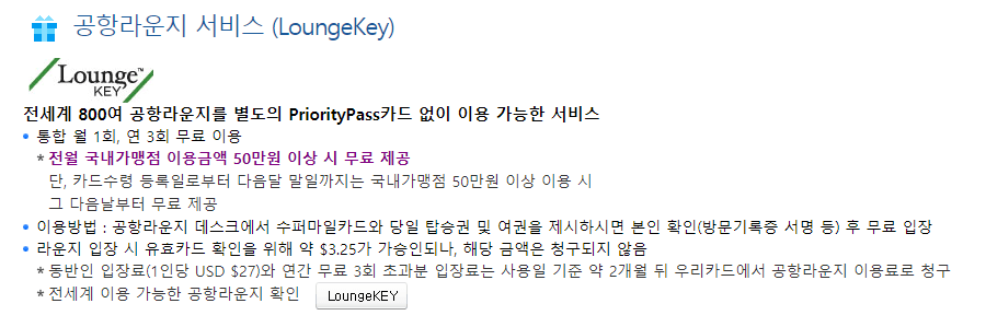 통합 월 1회, 연 3회  전 세계 800여 개의 공항 라운지를 무료로 이용할 수 있습니다. 단, 전월 국내가맹점 이용금액이 50만 원 이상이어야 합니다. 이용가능 한 공항 라운지는 여기에서 확인할 수 있습니다.