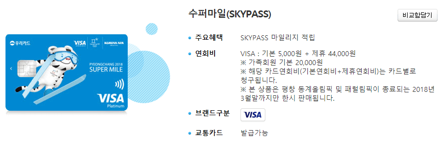 우리카드 슈퍼마일 신용카드에 대해 알아보겠습니다. 슈퍼마일 카드는 대한항공 SKYPASS 마일리지 적립이 주요혜택인 신용카드로  평창 동계올림픽과 패럴림픽이 종료되는 2018년 3월 말까지만 일시적으로 판매되는 카드입니다.